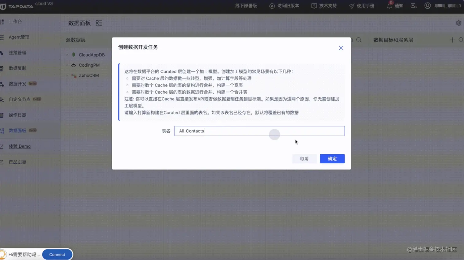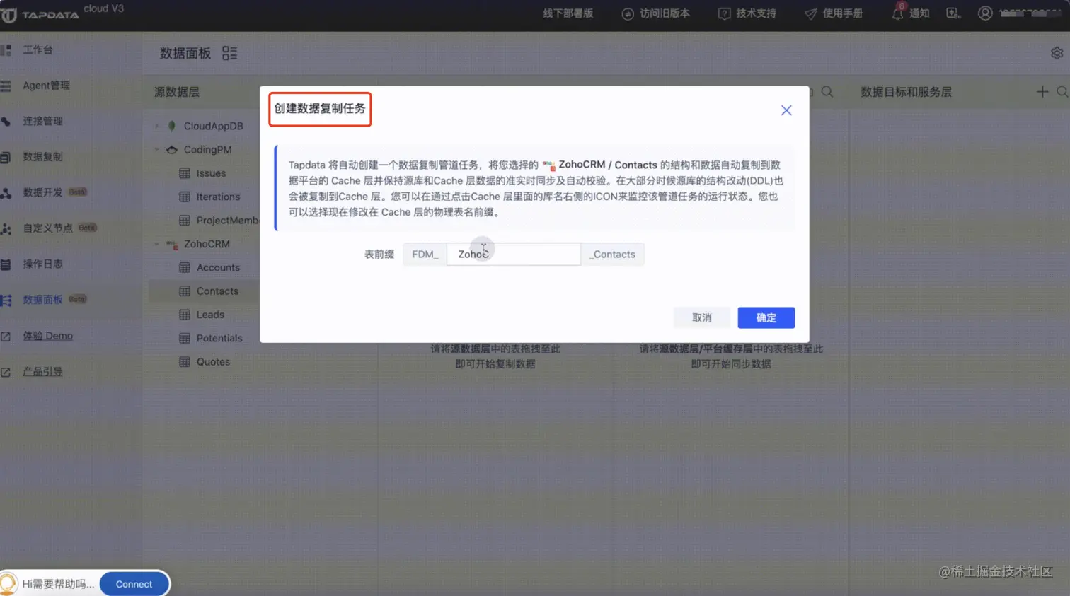 Tapdata 内置 100+ 数据连接器,已涵盖所有主流数据库,无需代码即可实现连接,无论是数据库,SaaS 还是文件都可以支持。两分钟即可完成 MongoDB、Coding PM 和 Zoho CRM 这三个系统的对接工作。