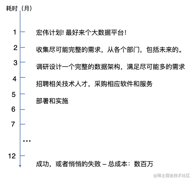 现在假设某企业希望搭建一个数据治理平台,用于对企业的数据进行规范化的治理,以应对各种新场景的需求,在文档部分,就可能要考虑到包括数据采集、集成、标准化、建立数据目录、数据质量、元数据和主数据管理,以及安全权限和如何发布服务等方方面面细枝末节的问题和需求。在这之后,还需要经过反复的评审和预算评估,才有机会立项,之后才是根据技术选型的采购和开发推进。但直到这一步,该项目最终能够产生怎样的业务价值都还是未知数。在未来面前,有的都只是畅想和可能性。这也是一些大数据项目常停留在数据的收集和存储阶段,却很难最终落地的原因。