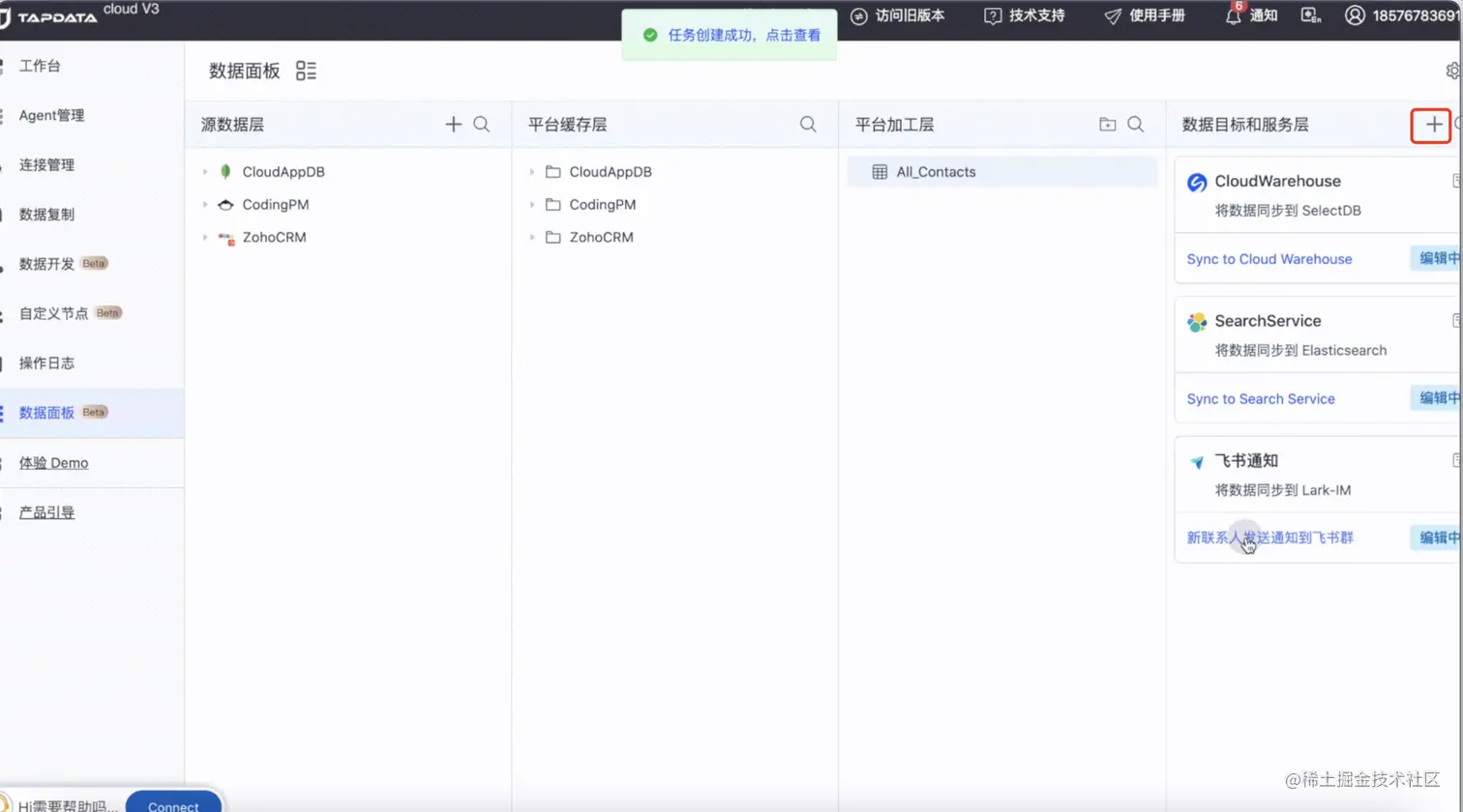 但在洞察之外,我们集中起来的数据还有更广阔的应用场景等待我们来挖掘。例如将数据从关系数据库同步至 Elastic Search 用于全文检索;推到云数仓 SelectDB 做数据量更大的分析任务等等,在 Tapdata 这样的数据集成工具中,这一步也变得尤其简单。因为我们的数据已经整理好了,都只需要通过数据目标和服务层,将数据推上我们想要的目标即可。