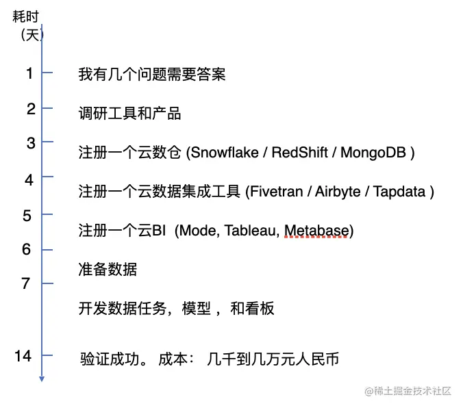 这种方式的特征在于,现代数据栈工具种类繁多,当我们需要用到拥有某种技术能力的工具时,往往可以快速地做出合适的选择,并上手运行,且无需花费巨额成本。丰富的云产品,以及海外非常流行的 SaaS 工具,更是将这一优势再放大。耗时一两周快速实现新的数据需求,并将成本成功控制在几千到几万,甚至免费,也将不再是天方夜谭。