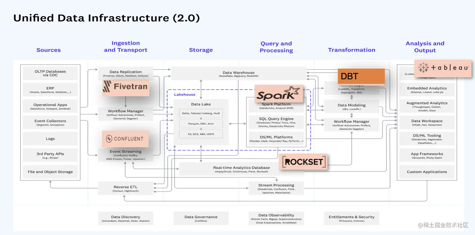 这篇文章里,很好地归纳了新一代数据基础架构的主要组成部分。他将数据基础架构全生命周期分成了如下几个阶段:采集与传输 → 存储 → 查询与处理 → 建模与转型 → 分析与输出。