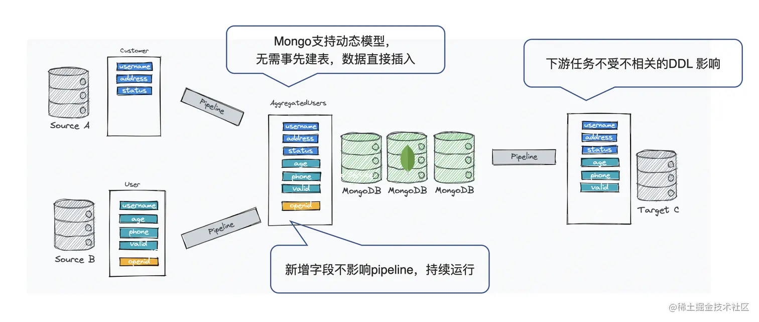 数据集成或数据同步的另一个常见“坑”是 DDL。理论上,上游执行 DDL 后,所有下游业务都要被通知到才能保证整个数据链路的准确性,但这无疑是个不切实际的要求。为此,Tapdata 巧妙地使用 MongoDB 作为中间层,其灵活的 JSON 模型可以轻松处理不同系统之间的差异。当数据进入时,无需建表或进行任何 DDL 操作,因此可以保证数据的准确性和一致性。即使在 DDL 更新后,MongoDB 也可以保持稳定,只需要将新增的字段直接添加到数据中即可,因此对下游系统的影响极小。