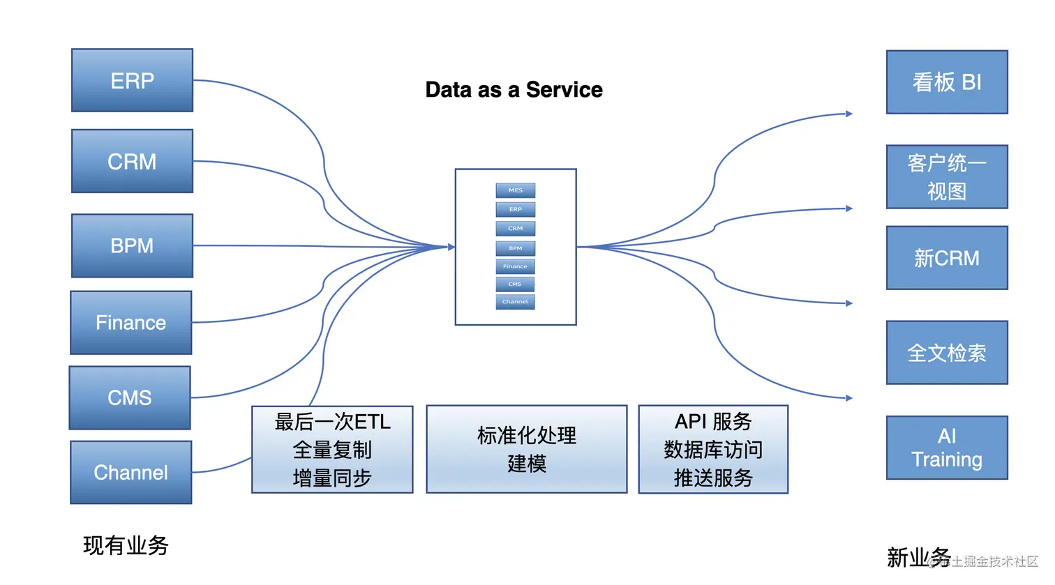 DaaS 方案则强调对数据“做最后一次 ETL”,然后将数据放到一个中央化的存储中,建好标准的模型对数据按需进行处理,最后通过推送或 API 等方式,将数据提供给下游业务使用。