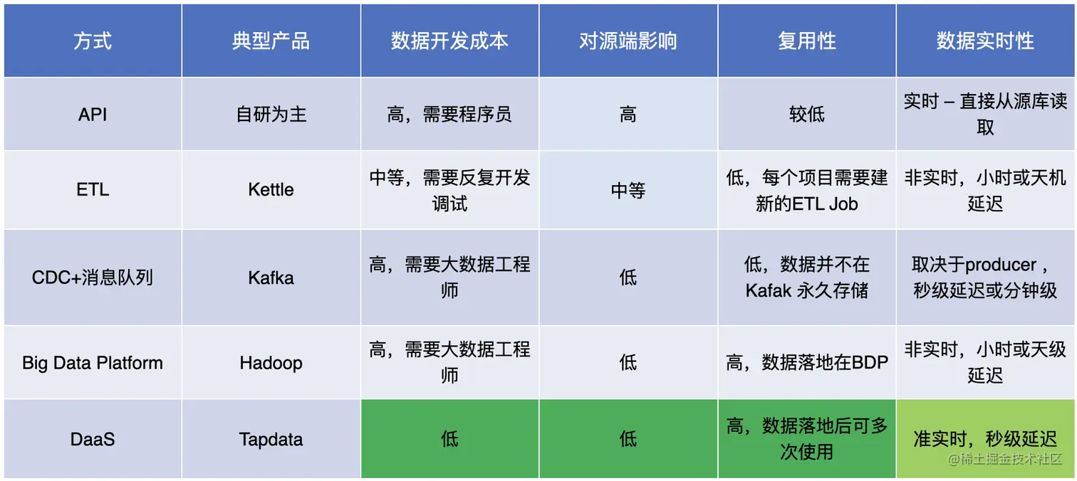 如上表所示,二者的核心区别主要体现在开发成本、对源端的影响、复用性以及实时性这几个方面: