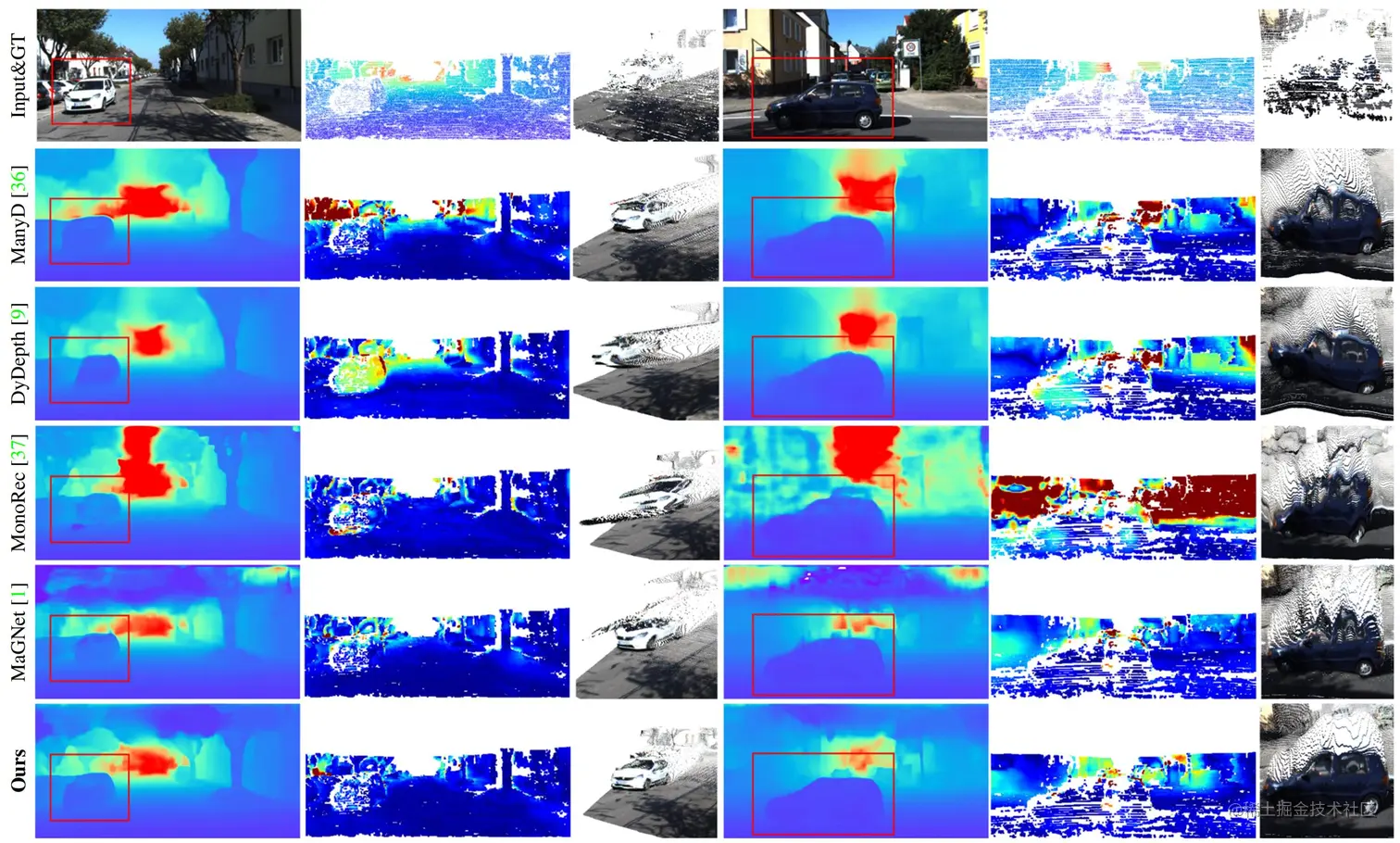如上所示,论文在KITTI Odometry数据集开展比较并分别展示多帧动态场景整体精度和动态区域精度。本方法动态误差相较以往最优方法显著降低超过 21%(Abs.Rel 0.141 → 0.111),同时达到了最优的全局深度估计精度。可视化结果表明,方法可显著降低动态区域深度估计误差,并可重建更符合的动态物体结构的三维点云。
