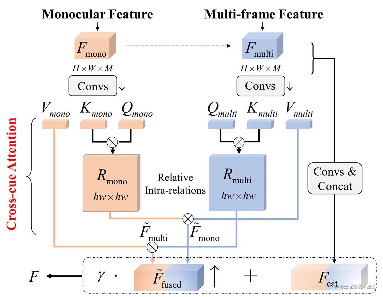 对于给定的单、多帧特征Fmono,Fmulti∈Rh×w×M,利用卷积将Fmono转换为query特征Qmono和key特征Kmono,同时将Fmulti转换为value特征Vmono。我们利用编码自单帧线索的Qmono和Kmono计算内部相对注意力权重Rmono,其构建了单帧深度线索内部的相对结构关系