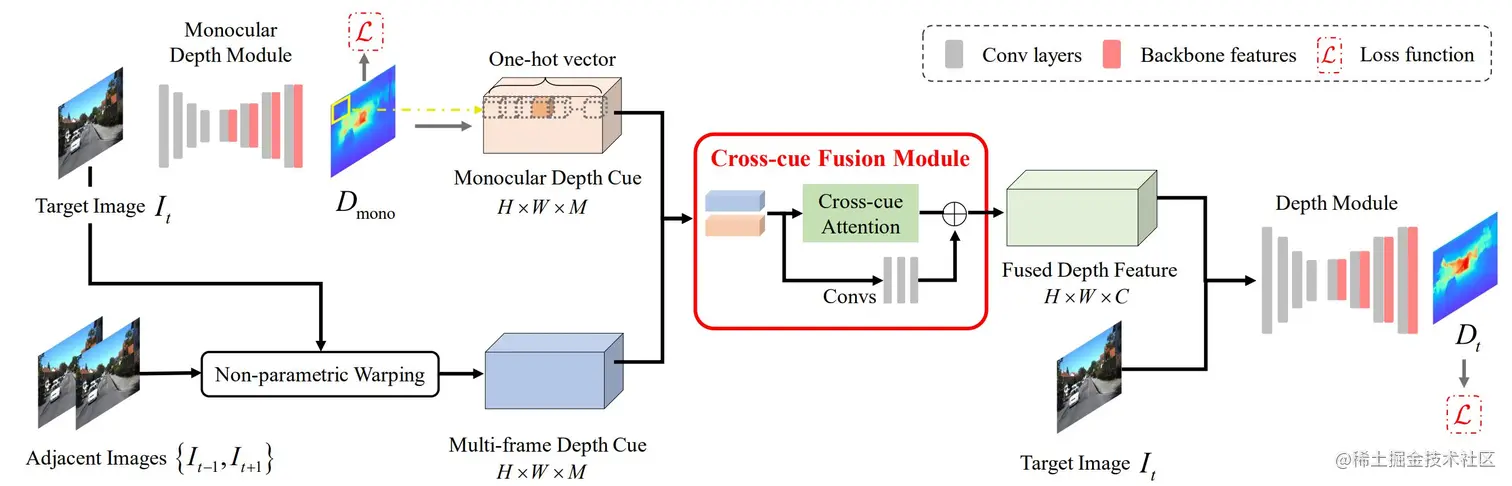 给定目标图像It∈RH×W,相邻帧(It−1,It+1)以及场景内、外参数K,T,本文目标为利用单/多帧信息的融合,估计目标帧It的深度值Dt∈RH×W. 如上图所示,论文主要模块包括:单/多帧线索(Monocular/Multi-frame Depth Cues)的代价体构造,单/多帧深度信息的跨线索融合模块 (Cross-cue Fusion),以及深度图回归网络(Depth Module)等。