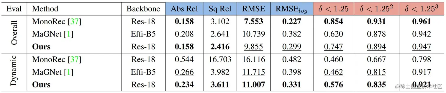 在以往方法中,单帧估计精度是制约动态区域效果的重要因素。论文展示了不同方法相对于其各自单帧网络在动态物体区域的性能提升。论文在动态区域估计误差比其单帧分支估计误差降低21.81%,显著优于其他方法(上表1~3行)。同时,在应用更优单帧估计网络的情况下,论文实现了基于更优单帧性能的同等幅度提升(上表3-4行),展示了其灵活性及可扩展性。