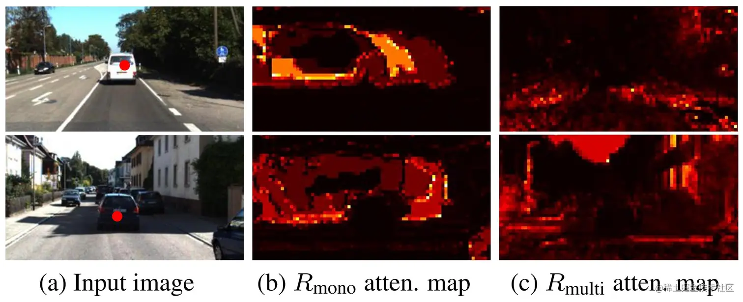 我们发现,跨线索注意力机制(CCA)能通过可学习方式选择性传递单/多帧线索中有助于提升对方的结构信息,从而避免了引入显式的动态物体分割方法。如上图所示,我们对动态区域采样点(第1列红点)进行跨线索注意力图Rmono,Rmulti可视化,其展示了网络所学习到的、各深度线索中有助于提升对方的结构信息分布。其中