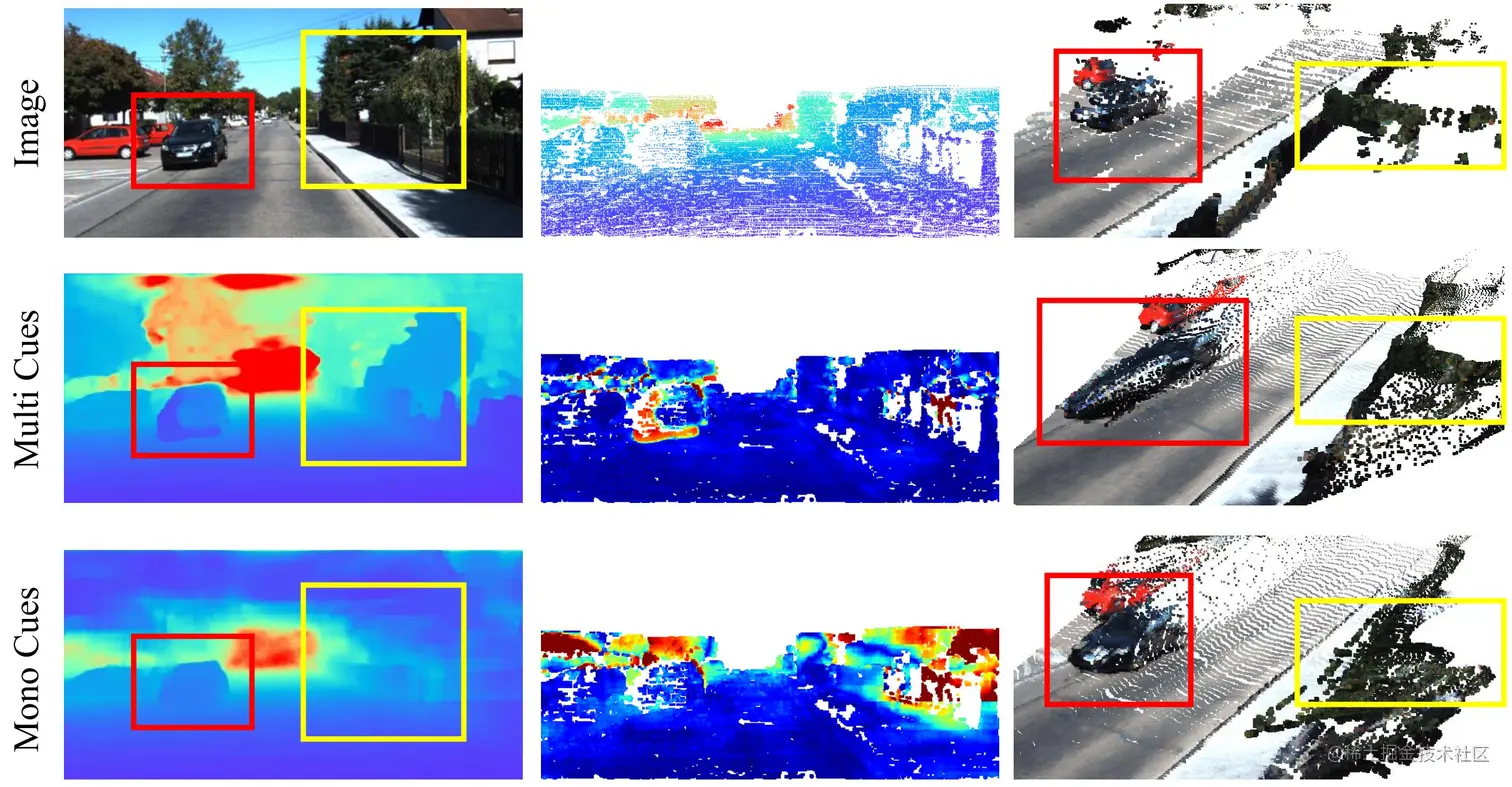 其中Fcat代表Cmono,Cmulti连接后经浅层CNN处理的特征,γ为可学习参数。我们将融合后特征F输入深度估计网络(Depth Module),从而得到最终的深度估计Dt。