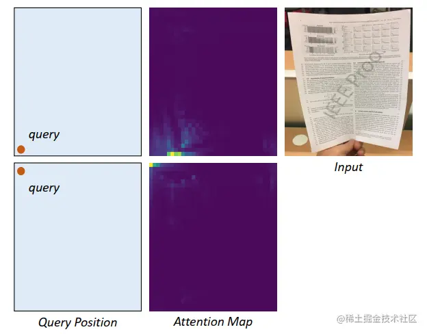 接下来,矫正解码器接收编码器输出的多尺度特征以及可学习的矫正提示向量序列(learnable queries),输出解码后的表征用于后续坐标映射矩阵的预测。其中,可学习的矫正提示向量序列零初始化,并加上固定的位置编码。实验发现,每一个矫正提示向量会关注输入形变文档图像中的某一特定区域 (如下图所示),这些区域组合起来便覆盖整张输入图像。同样,解码器由三个子模块组成,每个子模块包含两个标准的 Transformer 解码层。
