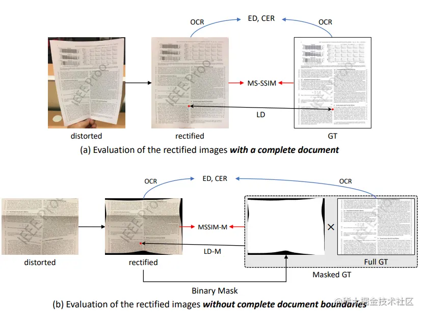 在这篇文章中,作者团队提出了两种新的评价指标 MSSIM-M 和 LD-M,用于通用形变文档图像矫正质量的评估。因为边界不完整的形变文档图像在矫正后可能会出现像素缺失,如上图所示,本文将有效像素区域的掩膜矩阵与目标图像进行矩阵乘法,得到更适宜进行评价的目标图像。如下图所示,与传统的 MSSIM 和 LD 指标相比,改进后的 MSSIM-M 和 LD-M 更为稳健和可靠。