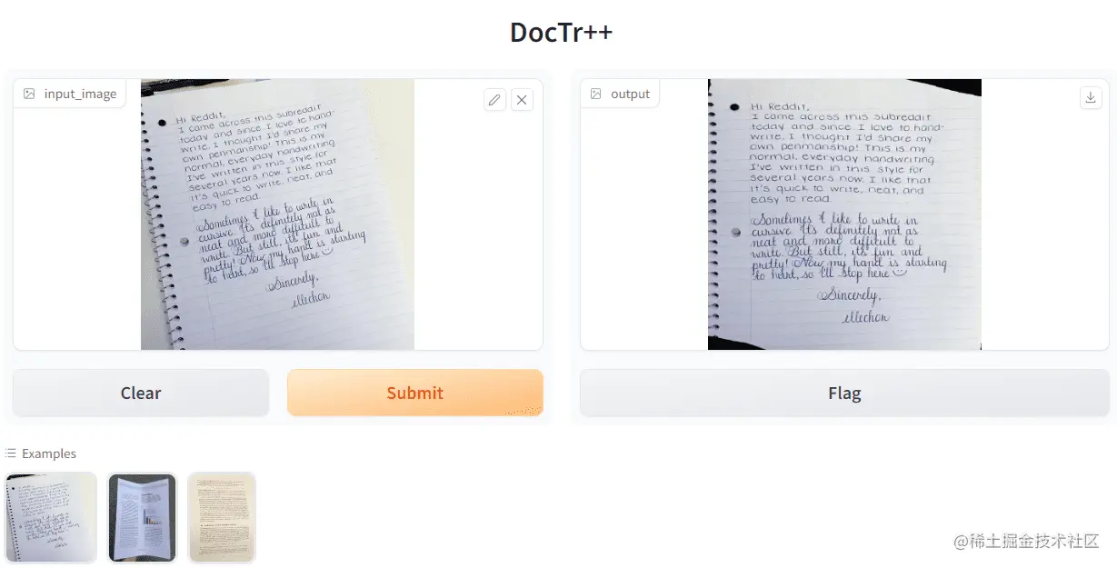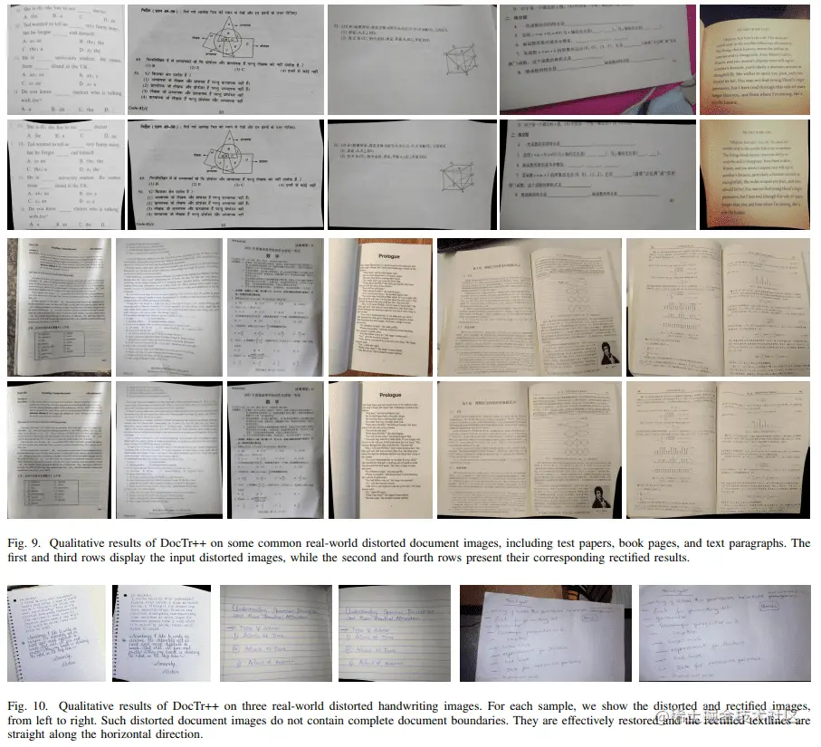 下图展示了各类形变文档图像的矫正结果,包括试卷、文本段落、书页、手写文档等。