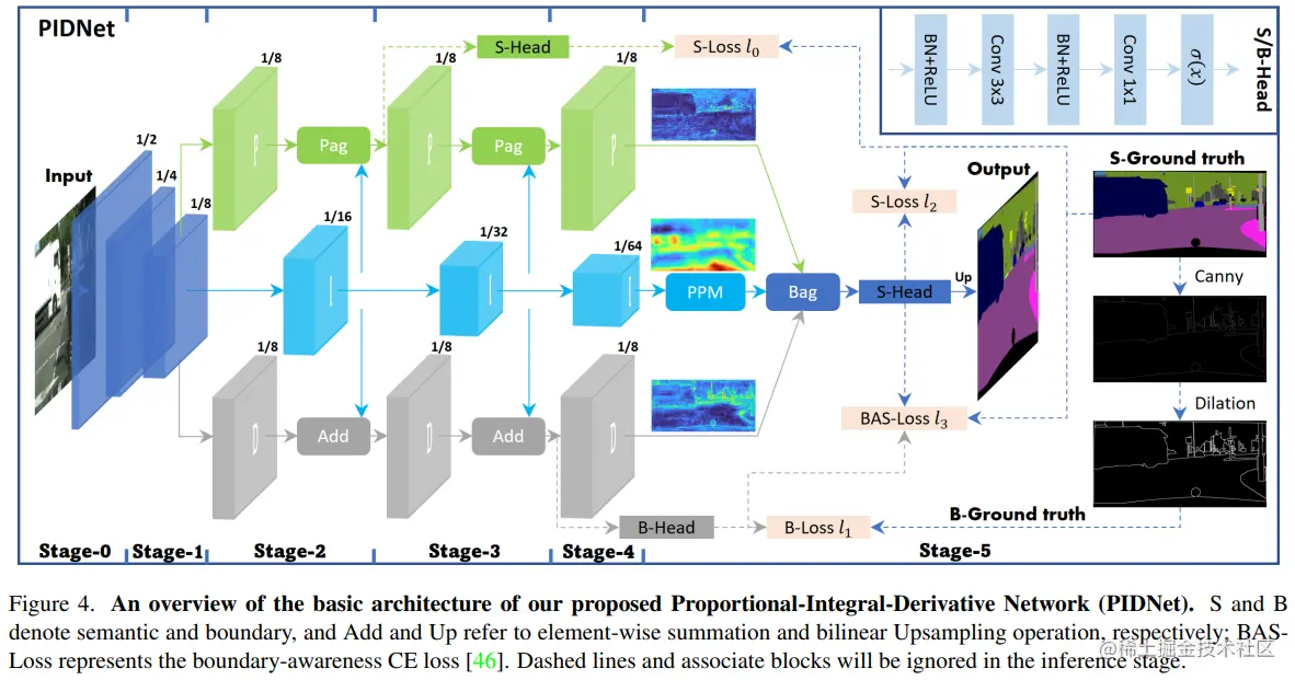 因此,为了缓解这个问题,本文在 TBN 上增加了一个辅助的导数分支 ADB,即在空间上模拟 PID 控制器,并突出高频语义信息。其中,考虑到每个 object 内部像素的语义是一致的,只有在相邻对象的边界处才会出现语义不一致,因此语义的差异仅在对象边界处为非零,所以 ADB 的目标是边界检测。遂本文建立了一种新的三分支实时语义分割体系结构,即比例-积分-微分网络——PIDNet,如上图所示。