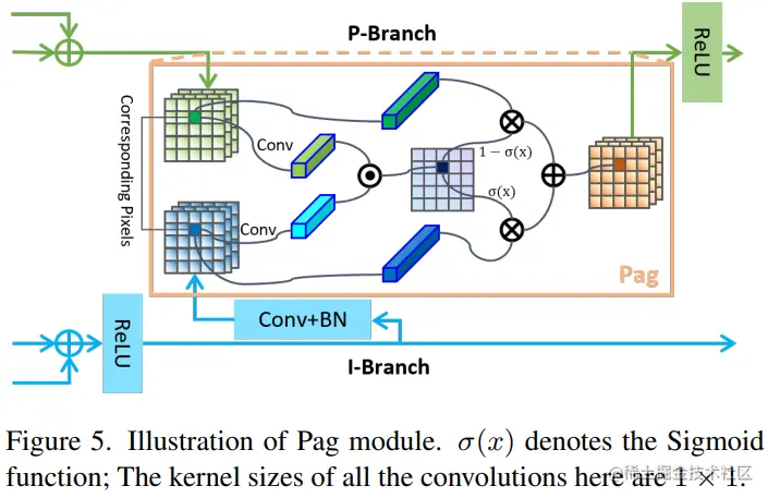 Pixel-attention-guided fusion, Pag, 即像素注意力引导模块,很好理解,就是将比例和微分分支的特征利用一个注意力机制进行交互增强。