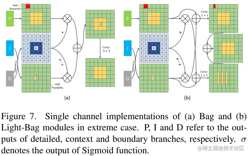 最后,边界注意力引导 Bag 模块的作用是利用边界特征来指导细节(P)和上下文(I)表示的融合,以实现更好的语义分割效果。作者指出,尽管上下文分支具有语义精度,但它在边界区域和小物体上丢失了太多的空间和几何细节,因此,PIDNet 利用细节分支来提供更好的空间细节,并强制模型在边界区域更加信任细节分支,同时利用上下文特征来填充其他区域。