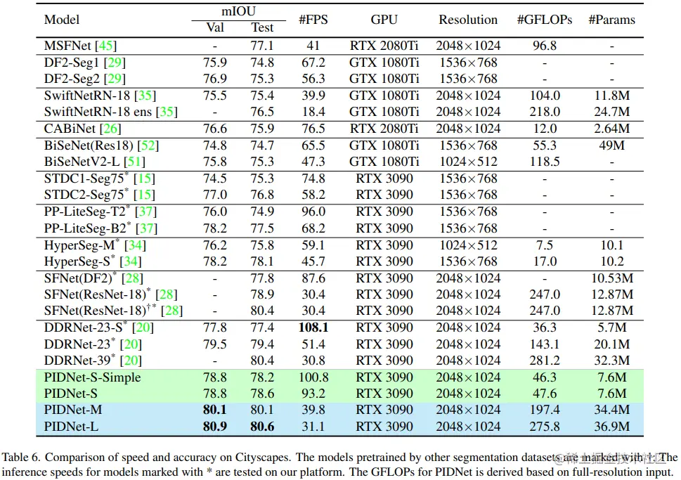 最终,PIDNet的精度超过了所有具有相似推理速度的现有模型,在Cityscapes和CamVid两个主流的道路场景解析数据集上实现了最佳的推理速度和准确度平衡。其中:
