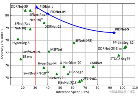 PIDNet-S在Cityscapes数据集上的推理速度为 93.2 FPS,mIOU 为 78.6%;CamVid数据集上的推理速度为 153.7 FPS,同时 mIOU 为 80.1%。