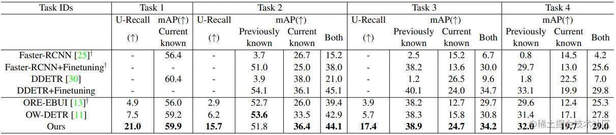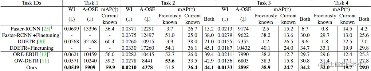 如上图所示,第一个任务的训练集来自PASCAL VOC,后面三个任务的训练集来自MS-COCO。 来自PASCAL VOC测试集的所有图像和来自MS-COCO的val集的选择图像构成验证集,其中标记了所有以前已知的类和当前已知的类,未知任务的所有类将标记为unknown.
