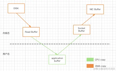 需要注意的是,DMA承担的工作是从磁盘的缓冲区到内核缓冲区或网卡设备到内核的soket buffer的拷贝工作,以及内核缓冲区到磁盘缓冲区或内核的soket buffer到网卡设备的拷贝工作,而内核缓冲区到用户缓冲区之间的拷贝工作仍然由CPU负责。