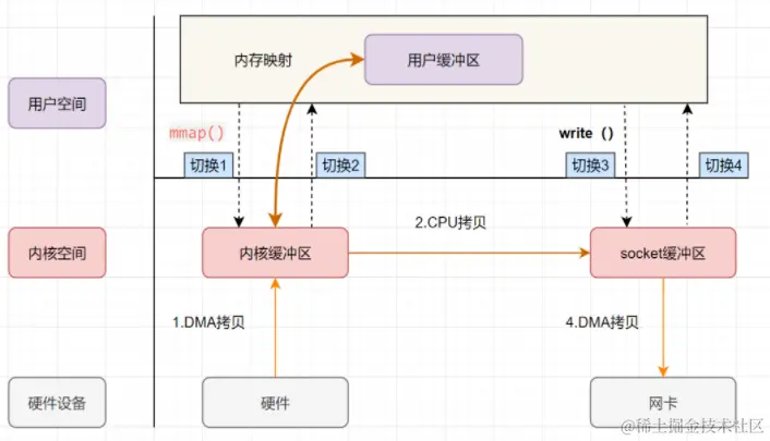 mmap 的零拷贝 I/O 进行了4次用户空间与内核空间的上下文切换,以及3次数据拷贝;其中3次数据拷贝中包括了2次 DMA 拷贝和1次 CPU 拷贝。所以 mmap 通过内存地址映射的方式,节省了数据IO过程中的一次CPU数据拷贝以及一半的内存空间
