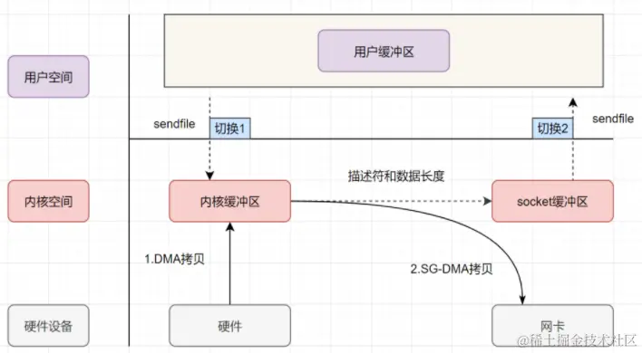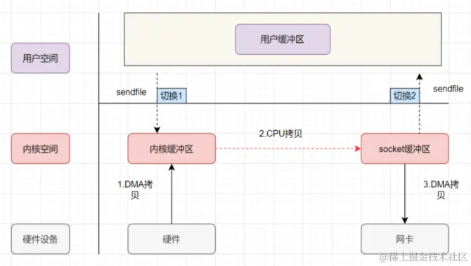 只要我们的代码执行 read 或者 write 这样的系统调用,一定会发生 2 次上下文切换:首先从用户态切换到内核态,当内核执行完任务后,再切换回用户态交由进程代码执行。因此,如果想减少上下文切换次数,就一定要减少系统调用的次数,解决方案就是把 read、write 两次系统调用合并成一次,在内核中完成磁盘与网卡的数据交换。在 Linux 2.1 版本内核开始引入的 sendfile 就是通过这种方式来实现零拷贝的,具体流程图如下: