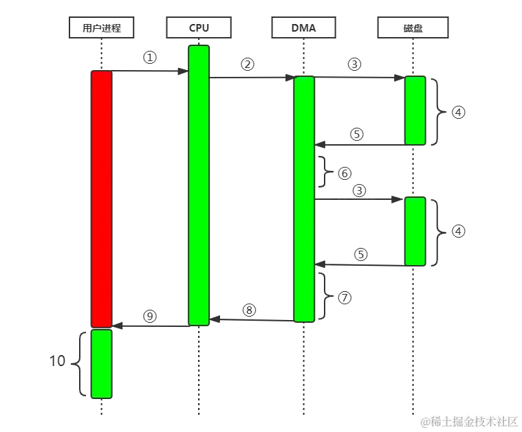 这个过程会涉及到两次缓冲区copy,第一次是从磁盘的缓冲区到内核缓冲区,第二次是从内核缓冲区到用户缓冲区(或应用缓冲区),第一次是cpu的copy,第二次是DMA的copy。