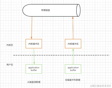 用户空间的应用程序通过read()函数,向操作系统发起IO调用,上下文从用户态到切换到内核态,然后再通过 DMA 控制器将数据从磁盘文件中读取到内核缓冲区