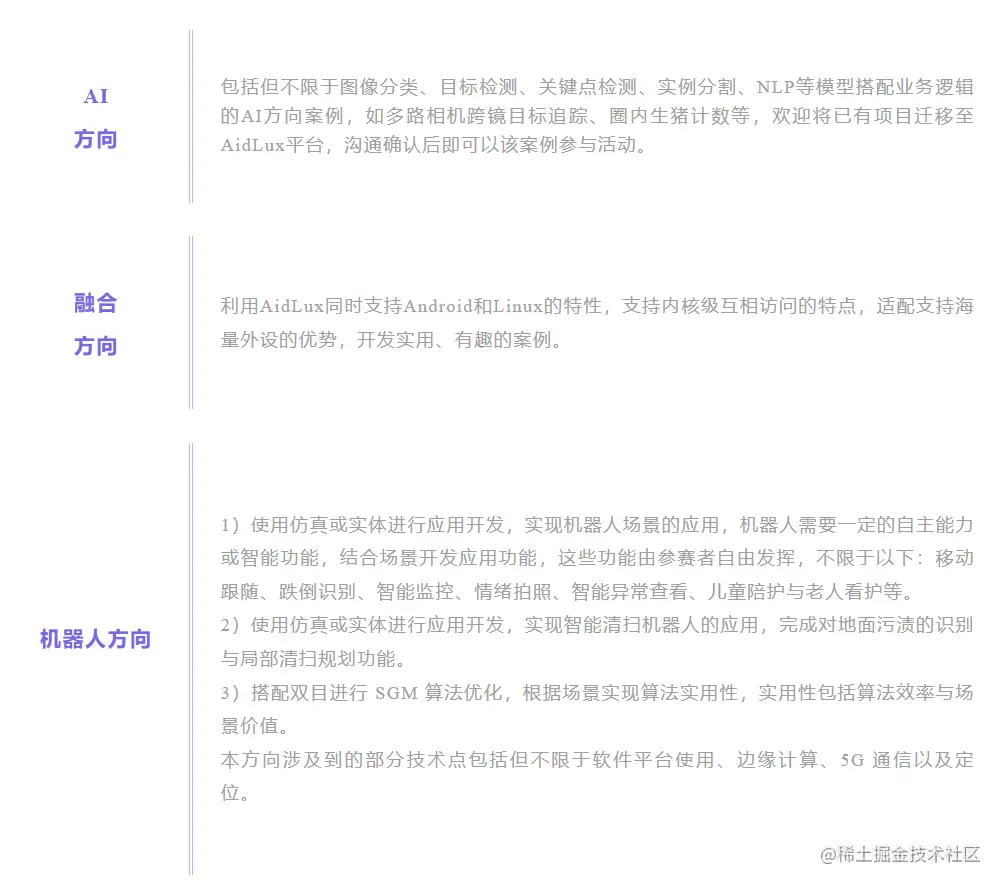 除固定命题外,开发者还可以联系AidLux小助手申报AI、融合系统、机器人等方向的开放命题: