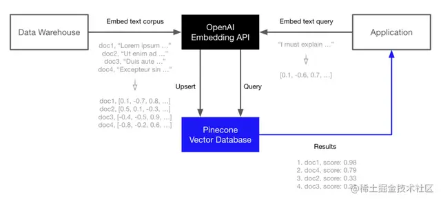 就拿Pinecone和OpenAI的结合来说,我们无需重新训练或发明任何东西,也无需微调,更不必收集数据标签。基本上只需用向量嵌入的形式将数据输入Pinecone就可以,网上有很多类似范例。我们可以实时向OpenAI提问,让它在Pinecone上查找相关信息。