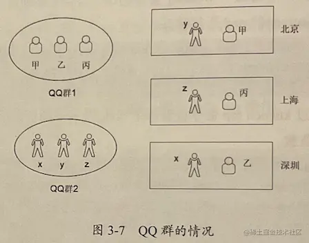 平时我们在QQ群里可以无障碍地聊天,但是具体的人可能是分布在不同的城市的,比如图3-7中甲、乙、丙在QQ群1里,但是人可能分别在北京、上海、深圳。x、y、z三人是在群2的,人也可能分布在不同的城市。QQ群就是这样的一种逻辑结构,不同的群是互相隔离的。虽然人物甲物和人物y都是在北京,但是他们之间是没有什么关系的,如图3-8所示。