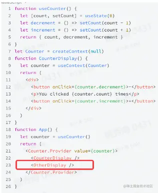 在这个例子中通过createContex和useContext,可以在App的子组件CounterDisplay中使用context从而实现一定意义上的跨组件通信。context的值一旦变化,所有调用了useContext)的组件均会重新触发渲染更新。由于context APl并不能细粒度地分析某个组件依赖了context里的哪个属性,并且它可以穿透React.memo和dependence的对比,所以针对频繁引起数据变化的场景,在使用时需格外谨慎。