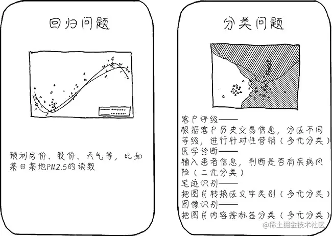 回归(regression)和分类(classification)是两种最常见的机器学习问题类型,如下图所示。