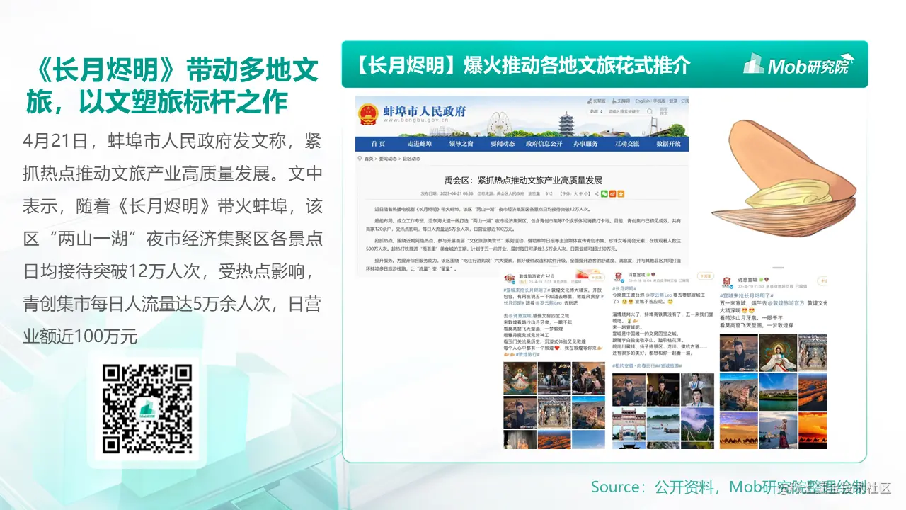 《长月烬明》不仅在线上一路刷新纪录,还意外带飞了多地文旅产业。起因是网友在追剧的同时,为剧中多个标志性场景、人物、道具一一找出了线下原型,纷纷手动艾特各地文旅局,表达了想要线下沉浸式追剧的愿望。蚌埠、敦煌、宣城等官方也快速做出回应,“各出奇招”晒出当地风景与人文特色,抢占这一波从“天”而降的流量。