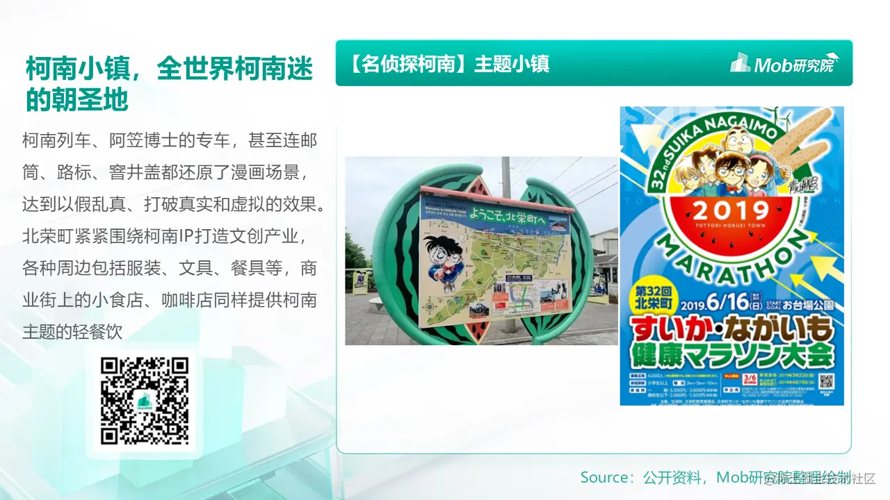 虽然北荣町因成功打造文化标识闻名于世界,但柯南小镇不只有沉浸式IP文旅。在IP之外,北荣町的魅力还来源于美丽的自然风光、原生态的农产品和丰富的历史文化资源。“西瓜山药健康马拉松”就是北荣町融合动漫文旅和农业的极佳范例,该赛事的代言人为柯南。参赛者身着柯南运动装,穿过西瓜田和山药田,既充满乐趣,又为本地农产品做了宣传。