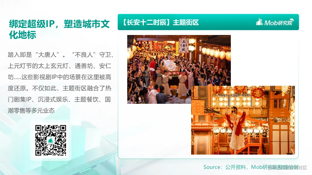 作为全国首个沉浸式唐风市井生活街区,被各大旅行博主推爆了的“长安十二时辰主题街区”,无疑是绑定超级IP、迎合消费升级需求、塑造城市文化地标的代表。踏入即是“大唐人”。“不良人”守卫、上元灯节的太上玄元灯、通善坊、安仁坊.....这些影视剧IP中的场景在这里被高度还原。不仅如此,主题街区以沉浸式文化体验为核心,依托古城西安文化底蕴,从深耕唐朝市井文化,到复刻长安的繁华过往,打造了原汁原味的全唐市井生活体验空间、雅俗共赏的唐风主题休闲娱乐互动空间、琼筳笙歌的主题文化宴席沉浸空间。