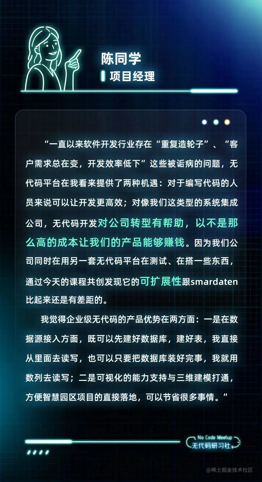 左右滑动查看更多思想的碰撞激发智慧的火花,用户们独到的观点让我们对无代码有了新的认知。