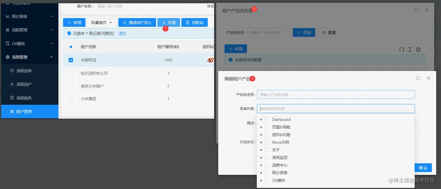 - 租户的个性化权限,可以通过租户下的套餐实现,自定义每个租户的权限