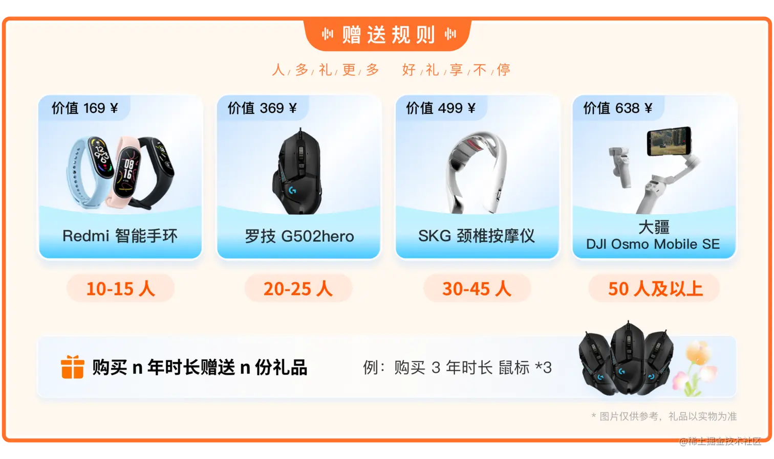 凡未购买过 Gitee 付费版本的企业,活动期间购买任意套餐,即可领取大疆手机云台稳定器、SKG颈椎按摩仪、罗技G502hero电竞鼠标、Redmi小米智能手环2等多重福利!购买多年时长还可以获得复数礼品哦。