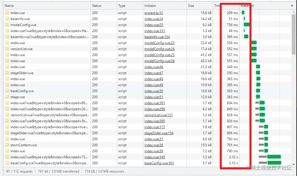 开发环境下,首次进入页面的时候会很慢,特别是切换页面的时候,特别明显,需要等待一定的时间才会跳转,体验很差,下图为部分资源的请求,请求的资源很多,组件之可能会有些依赖关系,这样渲染的时长就可能会是多个请求的时长的叠加。