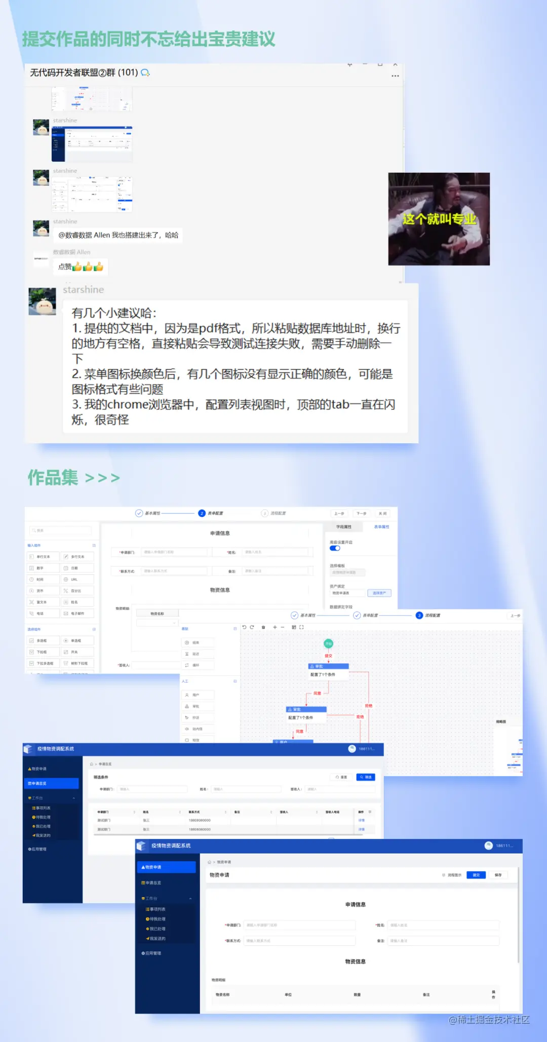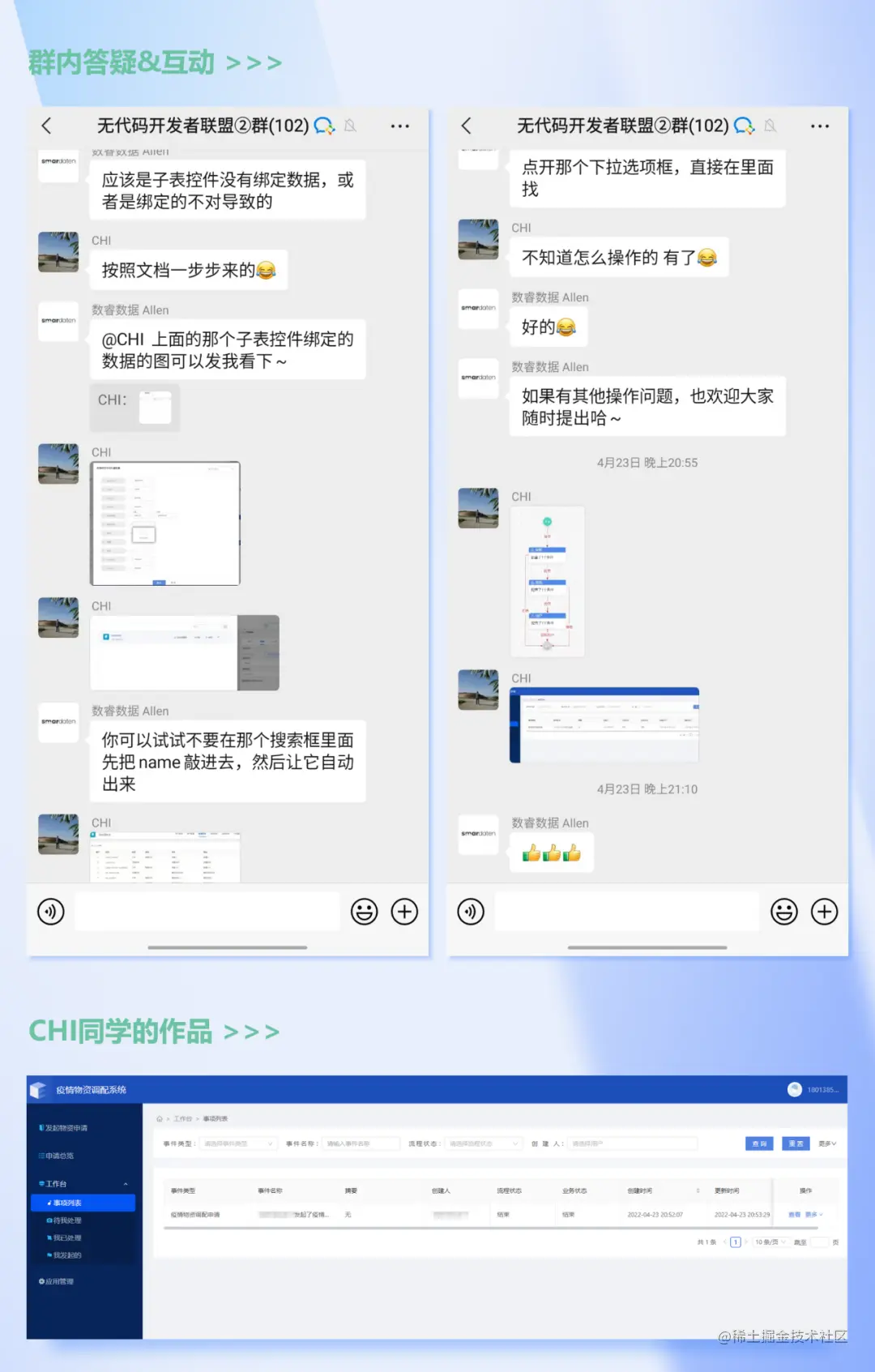 会后有同学提问今天搭建的应用能不能和之前学过的仓库管理系统做联动,让仓库根据物资调配提交的数量自动审核是否有库存等等,想法非常棒,smardaten表示后续会根据学员们的需求推出进阶版的课程,期待有更多人加入我们的开发阵地。