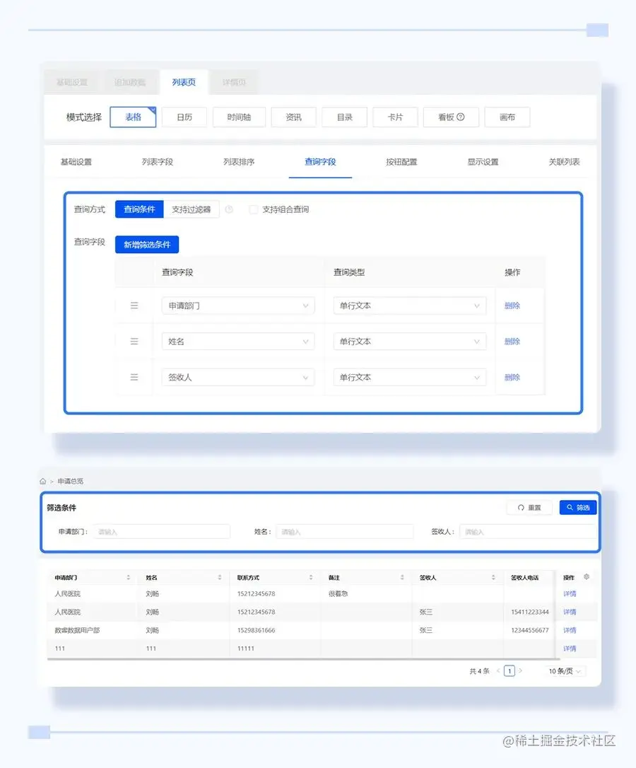 在【列表页】查询字段分页,点击新增筛选条件,增加申请部门、姓名、签收人三个查询字段。此时还无法看到设置的具体效果,在组装应用的时候,我们能看到“申请总览页”支持按部门、姓名、签收人进行筛选,是在这里发挥作用。
