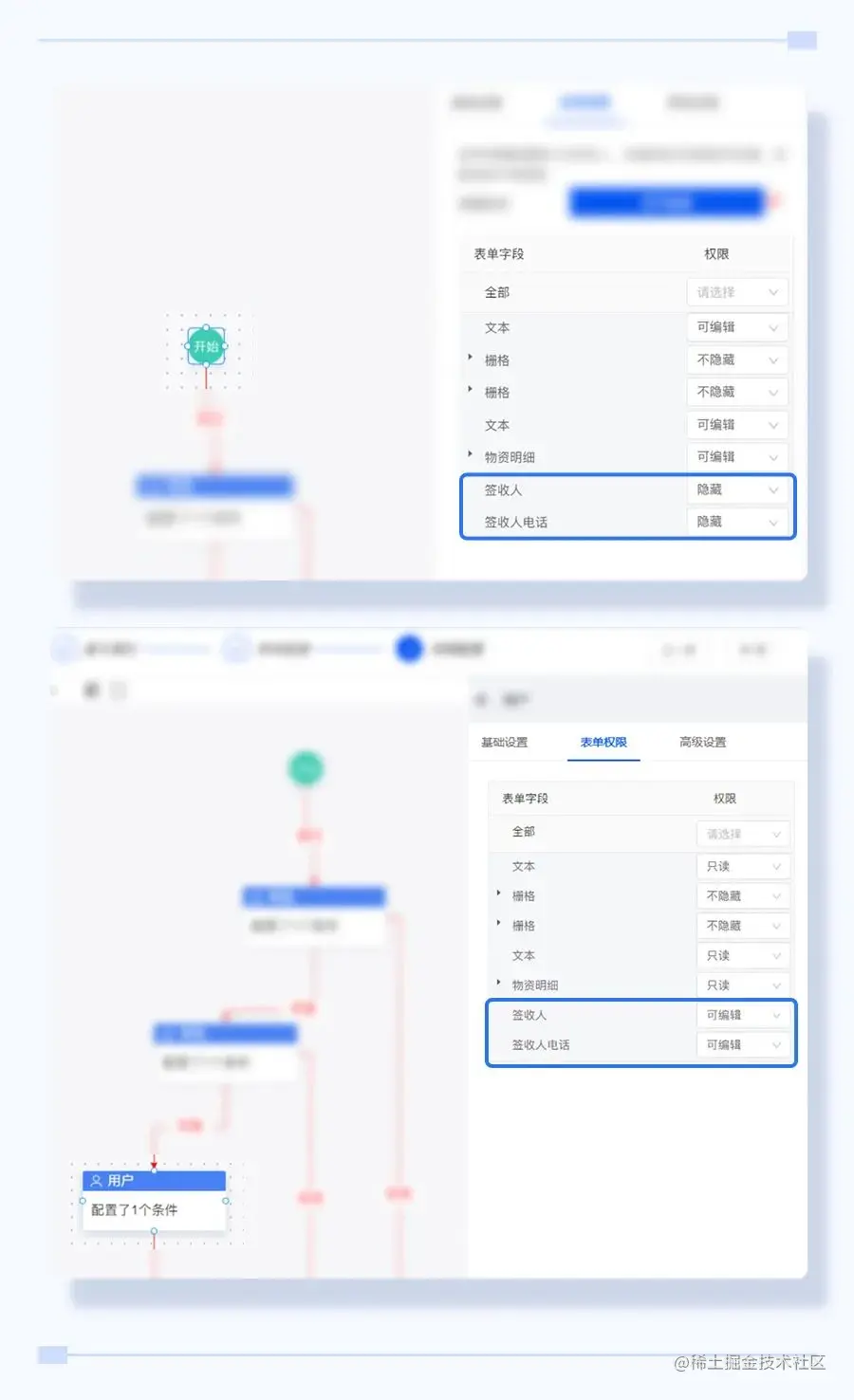 在“开始”、“审批”这些节点的配置边栏-表单权限中,将签收人和签收人电话改成隐藏,然后在“用户”的流程节点放开编辑权限,就ok啦~