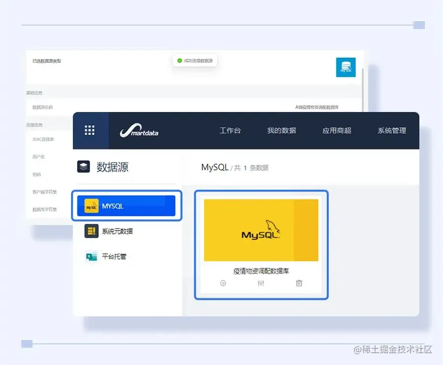 课程方提前准备了一个MySQL的数据库供大家连接使用,本次主要使用两个表:物资清单表(记录了目前支持调配的物资都有哪些)和物资申请表(记录大家发出的物资申请记录和流转的情况),连接数据源之后,需要关联数据库里面的表,配置数据库资产。