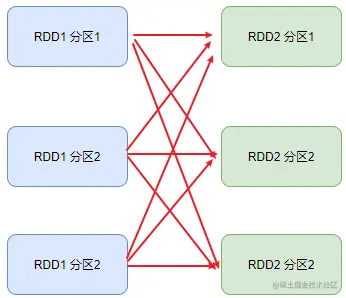 宽依赖(shuffle):父RDD的一个分区,将数据发给子RDD的多个分区;(需要依赖网络IO)