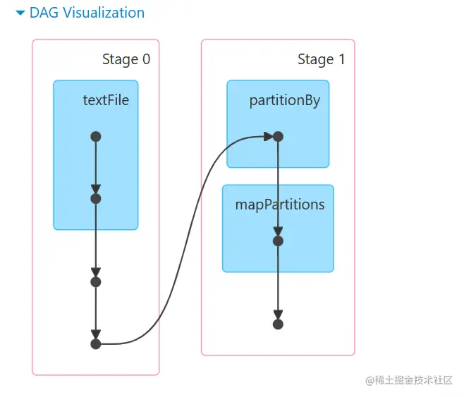 由于Spark是分布式执行的,所以DAG与分区也有关联;带有分区交互的DAG是在程序运行之后由spark决定的