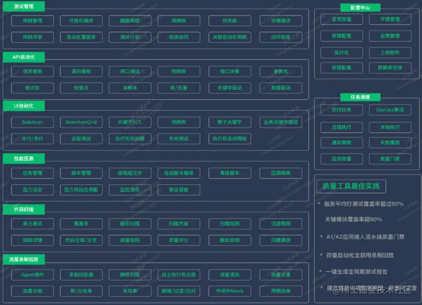 - 自动化回归:通过常态化定时任务回归、录制回放等方式实现高频高效的全量自动化回归测试验证