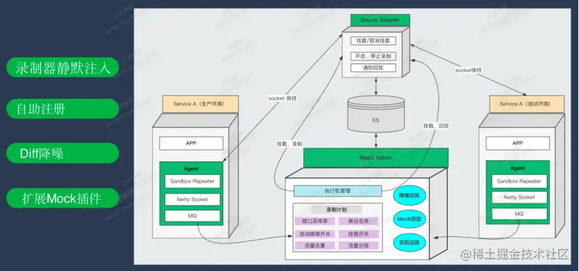 整体架构基于录制回放器的主路复制,设定接口采样率、流量分组等策略,应用端通过挂载注入录制器探针自动注册到服务端形成录制流量回流,平台层向回放器分发流量回放指令,从而形成基本的流量录制回放的闭环,支持Mock回放、自动降燥回放、普通回放三种模式的技术实现。