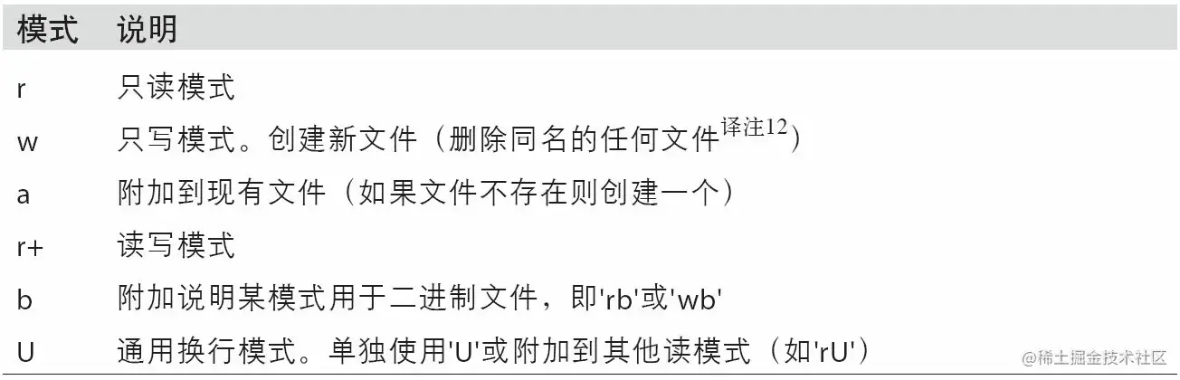 如果输入f =open(path,'w'),就会有一个新文件被创建在examples/segismundo.txt,并覆盖掉该位置原来的任何数据。另外有一个x文件模式,它可以创建可写的文件,但是如果文件路径存在,就无法创建。表3-3列出了所有的读/写模式。