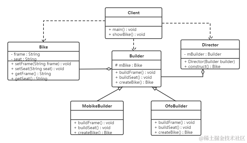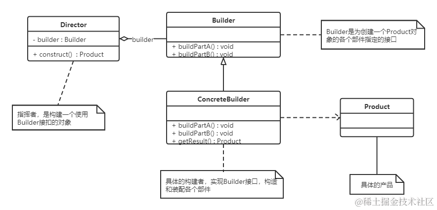- 在建造者模式中,客户端不必知道产品内部组成的细节,将产品本身与产品的创建过程解耦,使得相同的创建过程可以创建不同的产品对象。